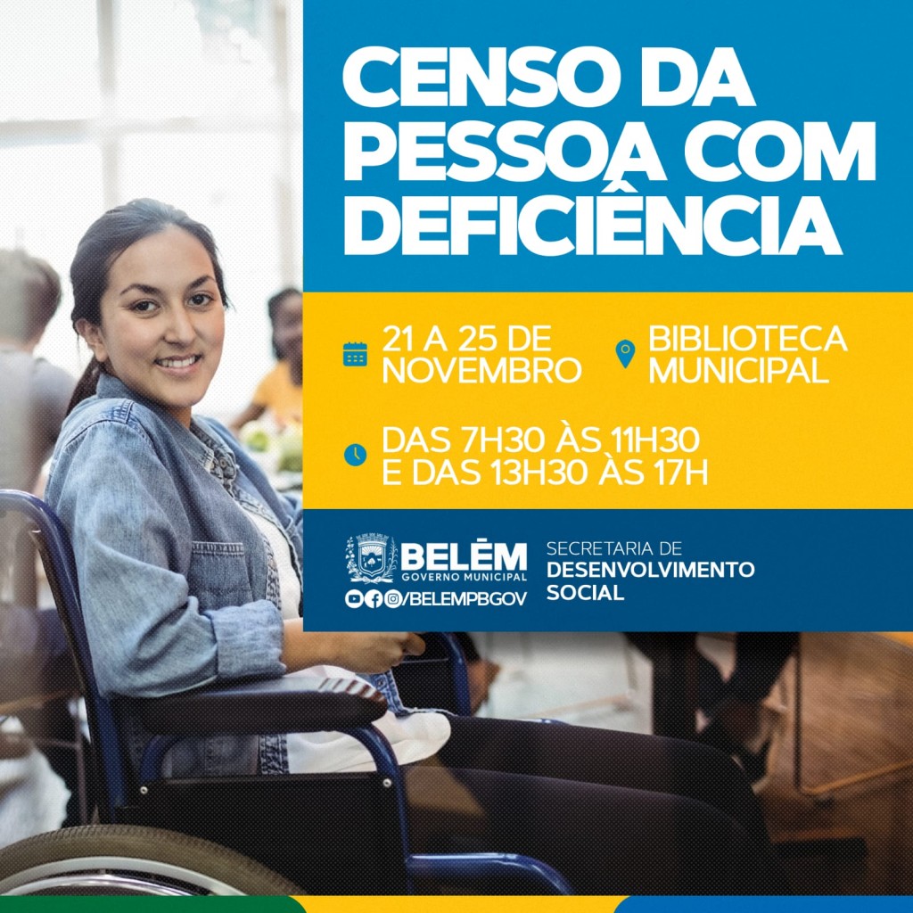 A coleta de dados para o Censo da pessoa com deficiência aqui no município de Belém inicia nesta segunda-feira (21). A equipe da Secretaria de Desenvolvimento Social estará realizando entre os dias 21 e 25 de novembro o preenchimento do cadastro do CPD na Biblioteca Municipal Prof.ª Maria Lira, nos turnos manhã e tarde. Também é possível o preenchimento do cadastro e envio dos dados através do link. Deve responder ao Censo pessoas que possuem deficiência visual, auditiva, intelectual ou física, e pessoa com transtorno do espectro autista (TEA).