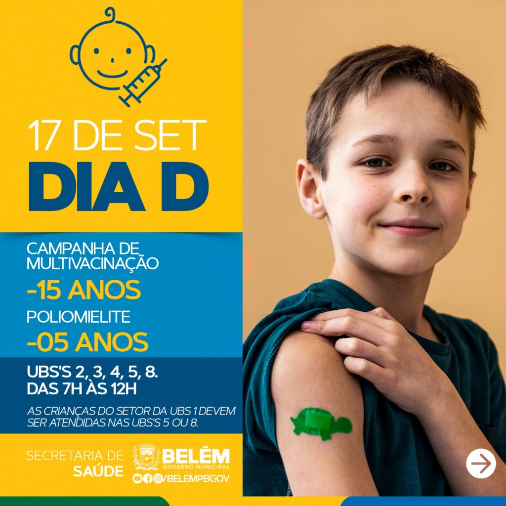 A Secretaria Municipal de Saúde estará realizando no próximo dia 17 de setembro mais um DIA D das campanhas nacionais de imunização contra a Poliomielite para menores de cinco anos e de Multivacinação para menores de 15 anos atualizarem a caderneta de vacina.