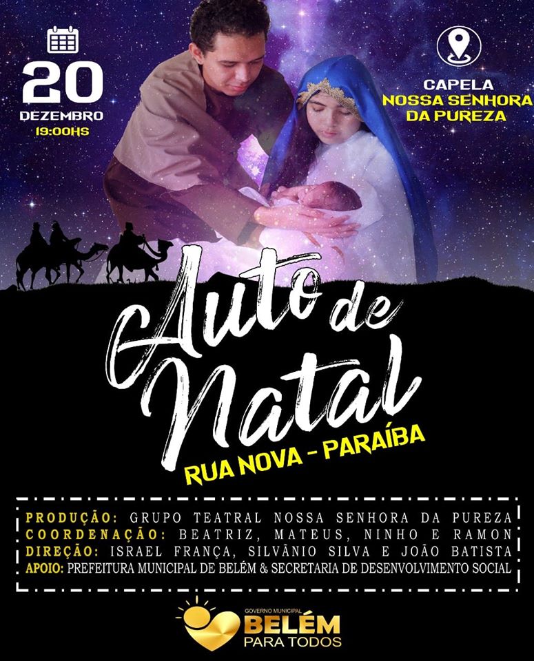 O Grupo Teatral Nossa Senhora da Pureza, do distrito de Rua Nova, no município de Belém, apresentará na próxima sexta-feira, dia 20 de dezembro, o Auto de Natal 2019. A encenação da história do nascimento de Jesus acontecerá em frente à Capela Nossa Senhora da Pureza, a partir das 19h.