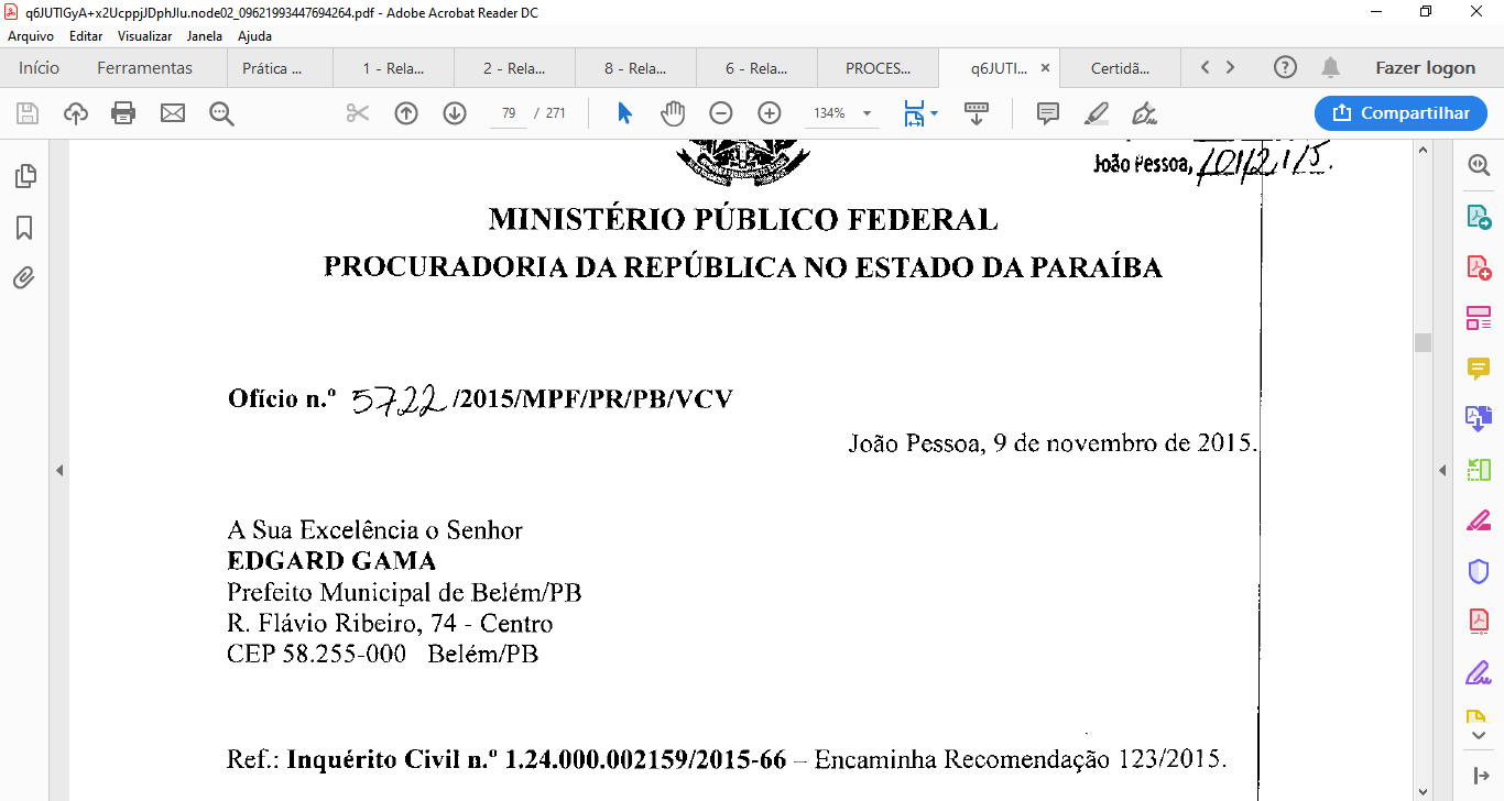 PRIMEIRO – A Ação Civil Pública de nº 0800354-46.2017.4.05.8204 que ensejou o pedido de Multa por parte do MPF foi ajuizada em 31 de julho de 2017 relativo ao descumprimento da recomendação 123/2015 expedida à Prefeitura de Belém – PB em 9 de novembro de 2015, ou seja, na gestão do Sr. Edgard Gama, por descumprimento dos requisitos previstos na Lei de Acesso à Informação, conforme se extra da tela abaixo juntada ao processo acima mencionado:
