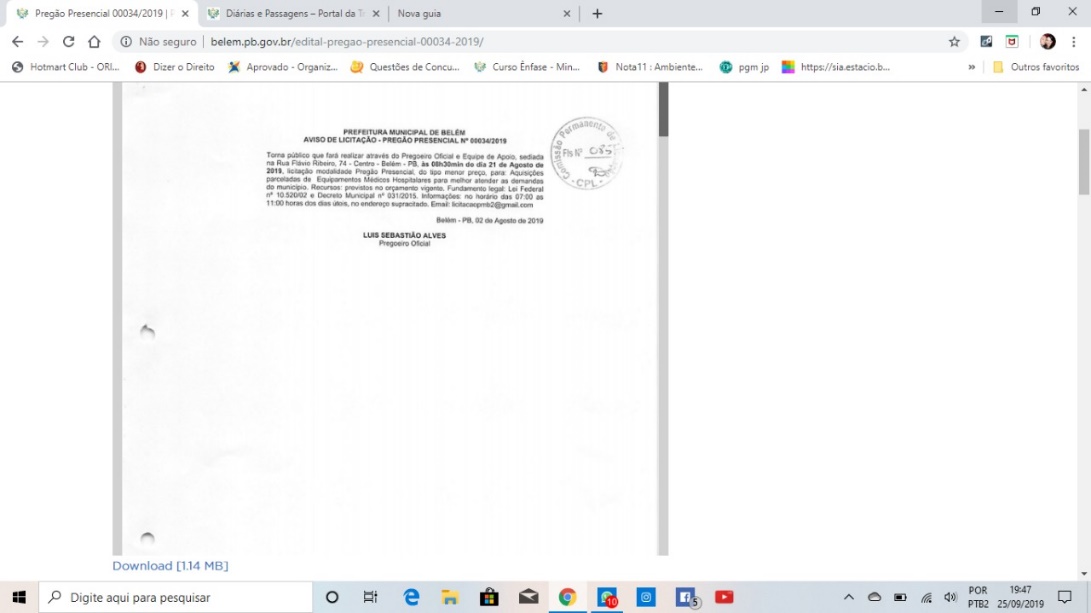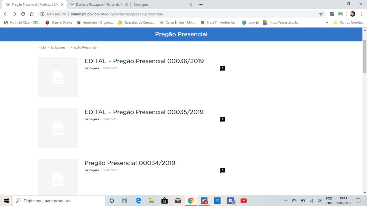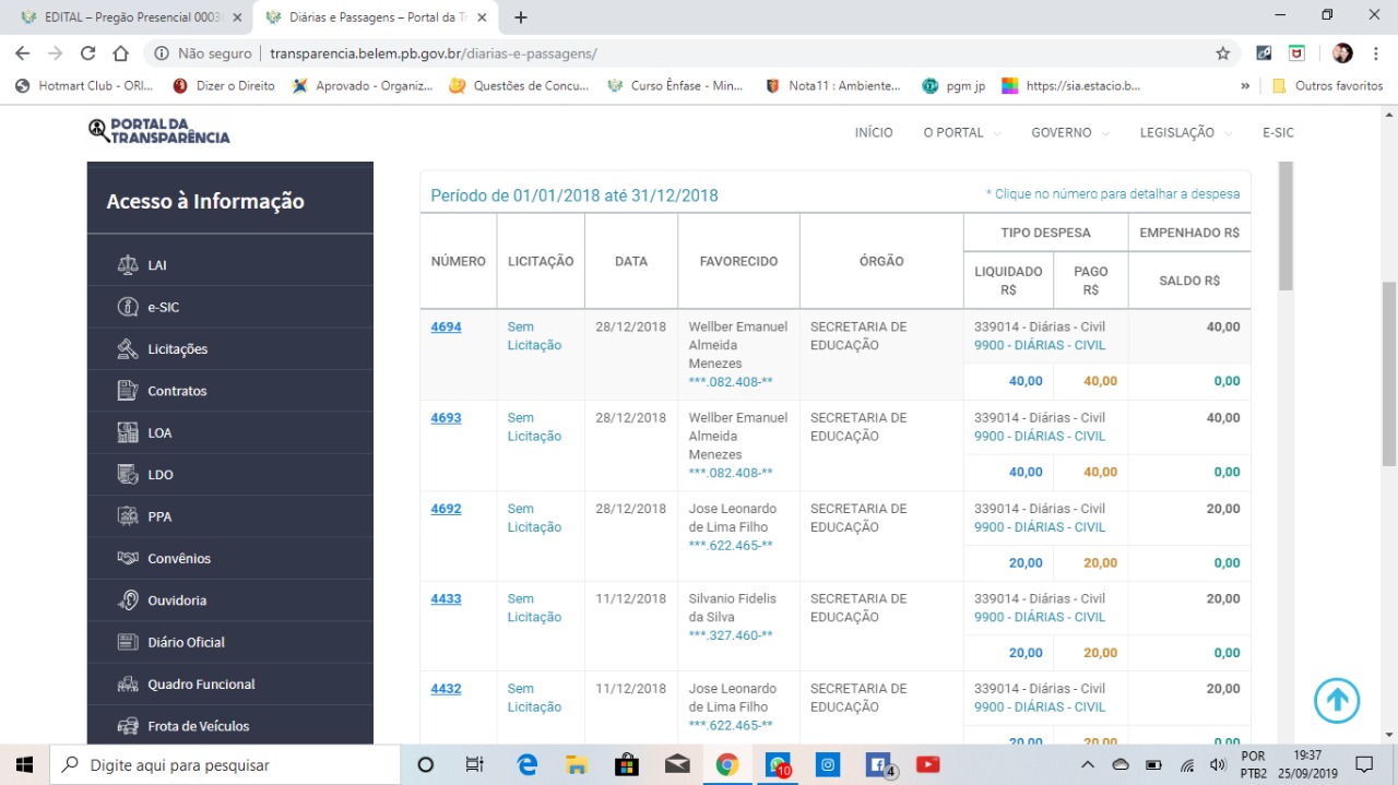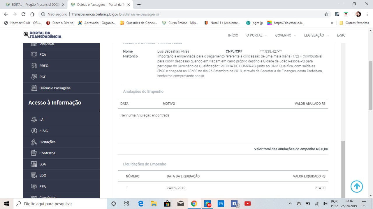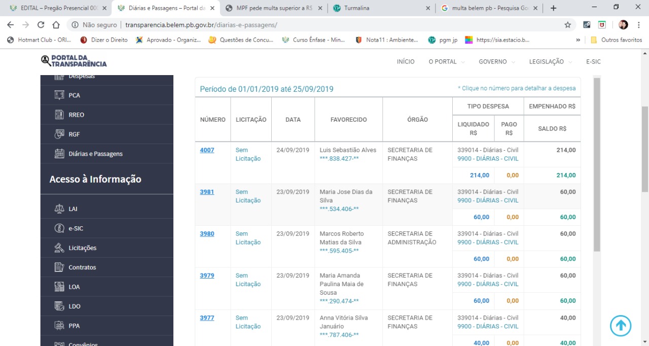 TERCEIRO – No tocante aos dois itens elencados pelo Ministério Público Federal, quais sejam, ausência de informações sobre pagamento de diárias e de editais de licitação, a Prefeitura Municipal de Belém – PB reitera o que já disse no processo, ou seja, vem cumprindo integralmente o que é exigido por lei, pois disponibiliza todos os dados referentes ao pagamento de diárias, assim como todo o processo licitatório, desde o aviso de licitação, edital e todo o processo após a homologação, conforme vê-se nas telas abaixo (clique nas imagens para ampliar):