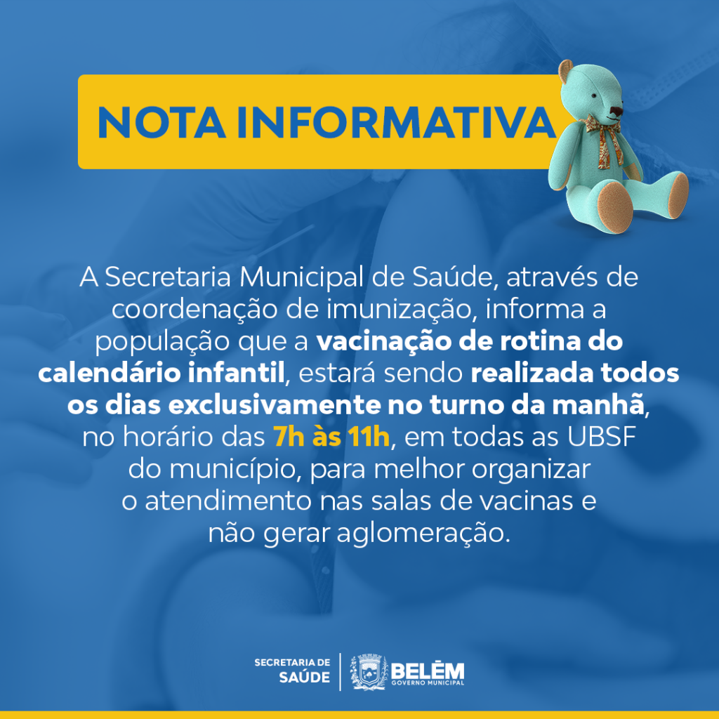 A Secretaria Municipal de Saúde, através da Coordenação de Imunização, informa a população que a vacinação de rotina do calendário infantil, estará sendo realizada todos os dias exclusivamente no turno da manhã, no horário das 7h às 11h, em todas as UBSF do município, para melhor organizar o atendimento nas salas de vacinas e não gerar aglomeração.