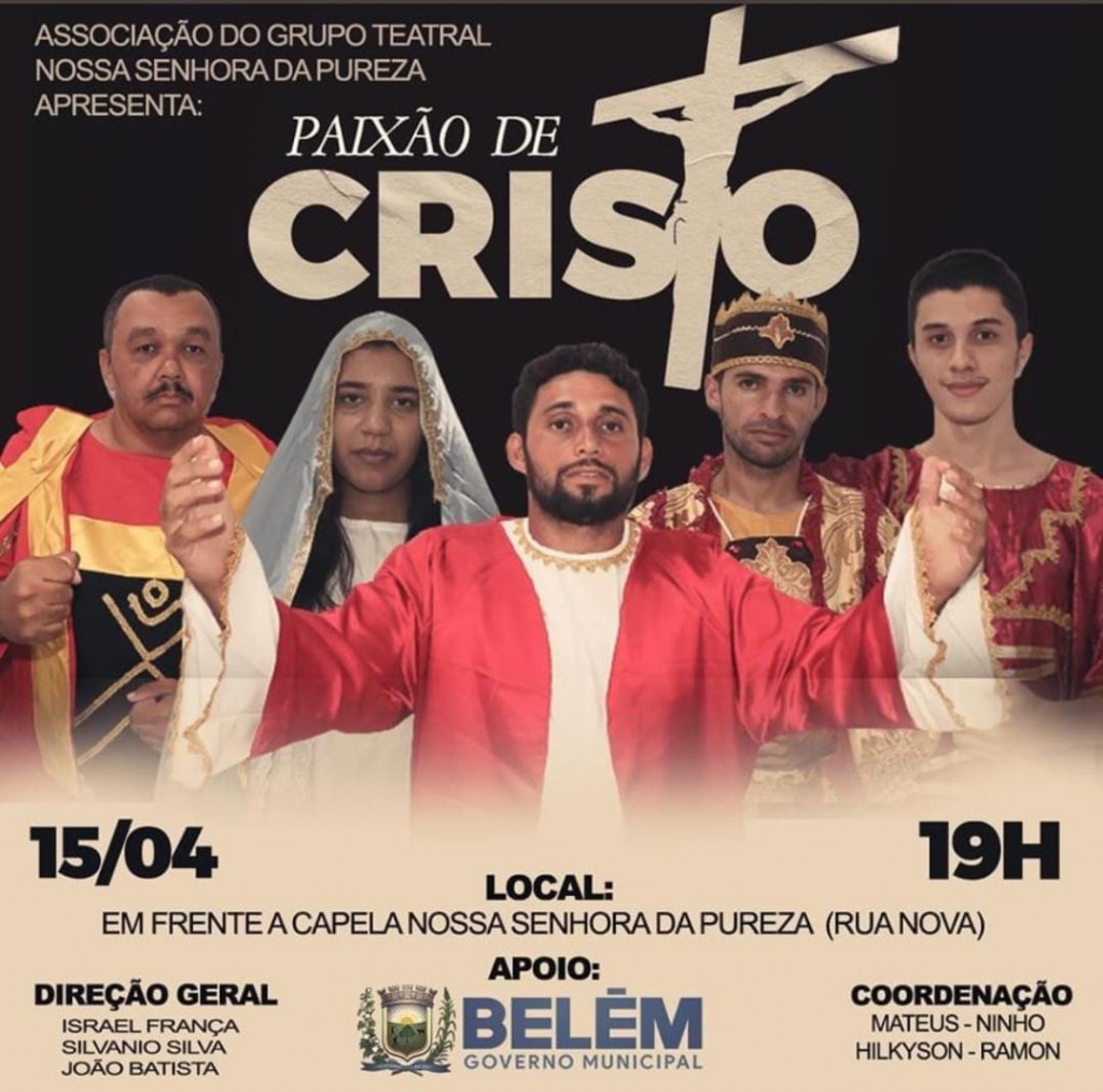 A encenação contará com a participação de jovens do Distrito de Rua Nova e da cidade de Belém, que vem se empenhando para reavivar a tradição do espetáculo da Paixão de Cristo, uma história que marcou a humanidade e até os dias de hoje é lembrada por todos. Toda a mobilização para a realização do evento tem despertado o reconhecimento de muitas pessoas, entre elas o ator Zé Dumont que em vídeo gravado parabenizando o grupo teatral, também agradeceu a Prefeitura pelo apoio que vem dando na realização deste evento importante para a cultura da cidade.