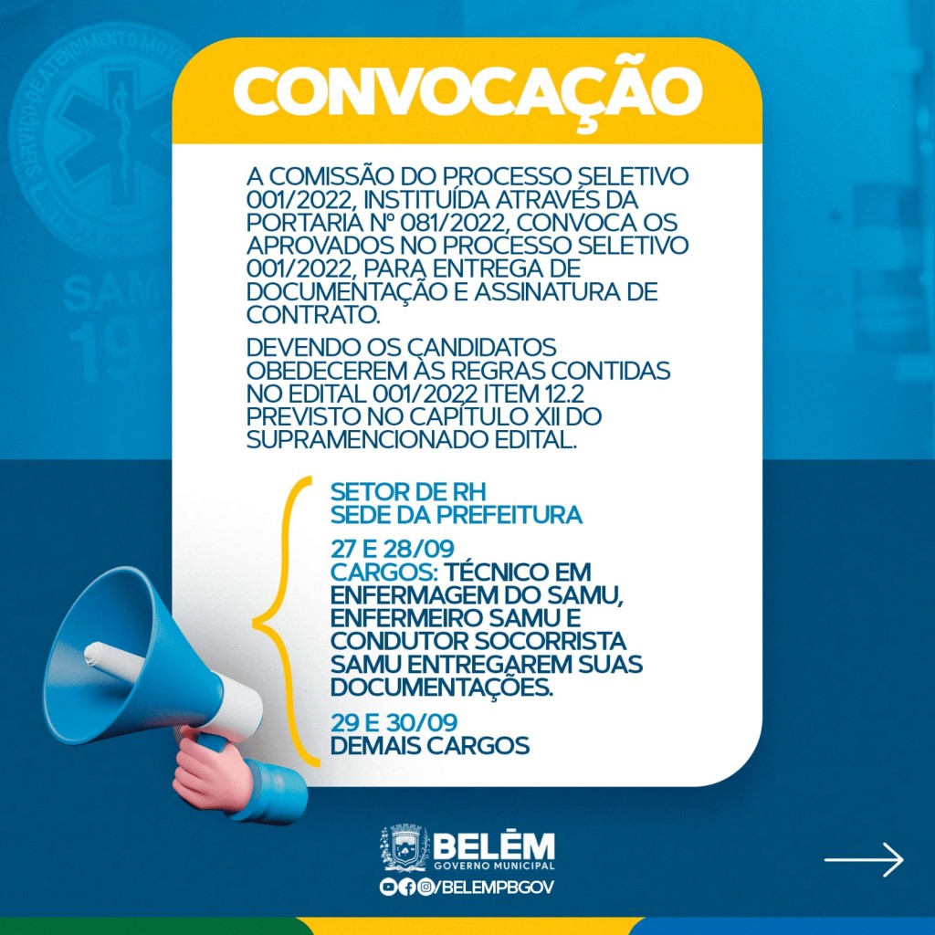 A Prefeitura Municipal está convocando os candidatos aprovados no Processo Seletivo Simplificado 2022 para comparecerem na sede da Prefeitura, no setor de RH, entre os dias 27 a 30 de setembro para a entrega de documentação e assinatura de contratos.