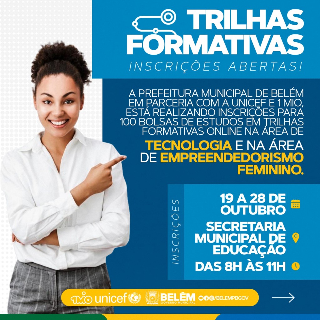 Estão abertas as inscrições para trilhas formativas online, uma parceria da Gestão Municipal com a UNICEF e a plataforma 1MIO que atua na inclusão produtiva de adolescentes e jovens no mundo do trabalho decente, oferecendo formação e oportunidades de empregos (Presencial e Remoto) com mais de 2.000 parceiros espalhados pelo Brasil.