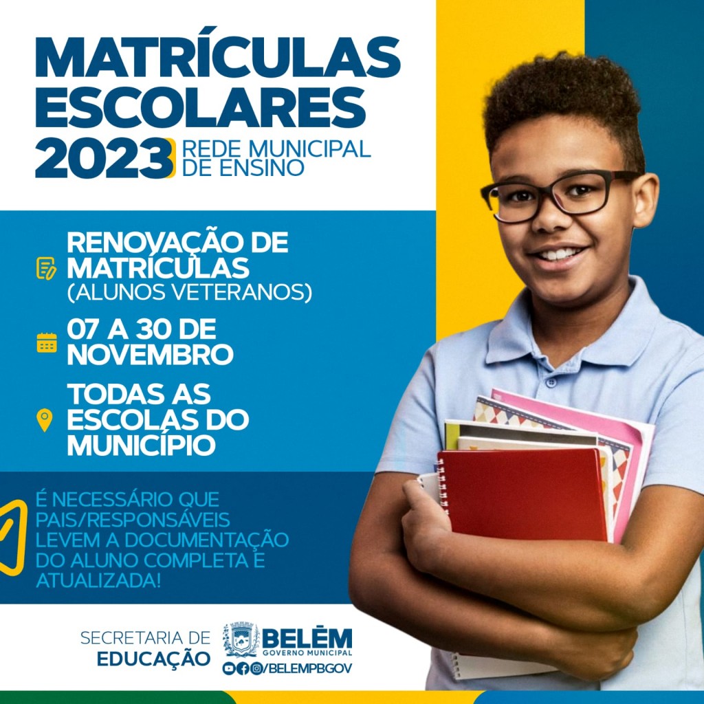 A Secretaria Municipal de Educação iniciou, nesta segunda-feira (07), a campanha de rematrículas nas escolas municipais de Belém. Inicialmente o período de 07 a 30 de novembro será destinado para renovação de matrículas dos alunos veteranos das turmas de ensino fundamental, os pais e mães deverão comparecer nas secretaria da unidade escolar a qual o filho (a) estuda.